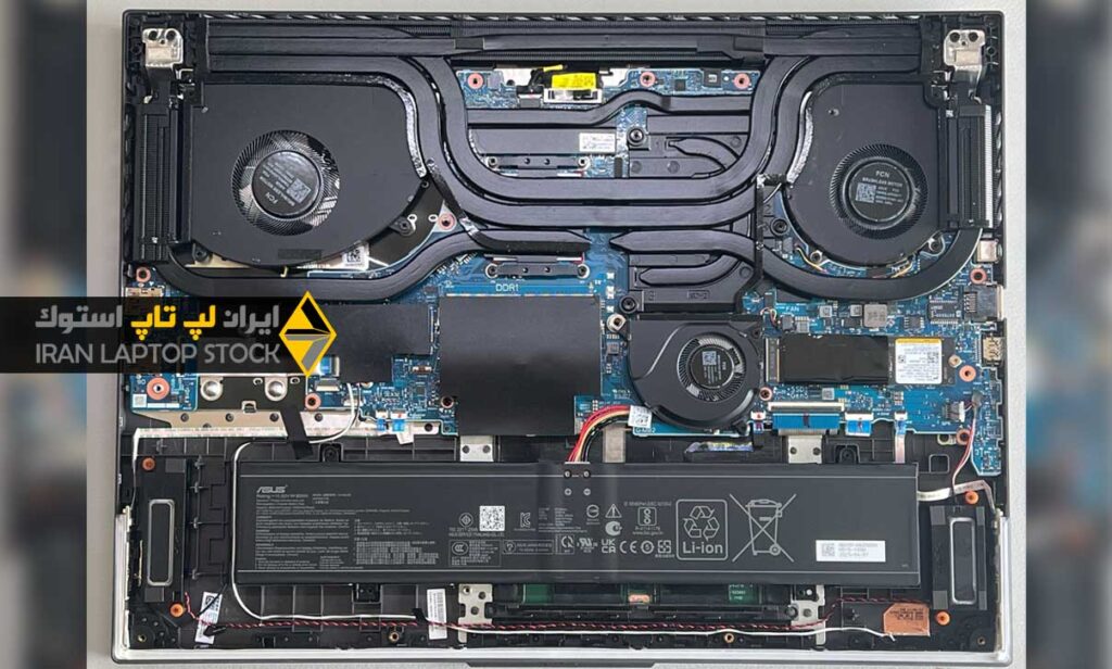 سیستم خنک‌کننده بزرگ با چندین فن و لوله‌های انتقال حرارت، دمای اجزا را حتی در هنگام بازی‌های طولانی کنترل می‌کند. ایسوس با بهینه‌سازی مسیر جریان هوا، صدای فن را در استفاده معمولی پایین نگه داشته اما در لود سنگین صدای آن کاملاً قابل شنیدن است.